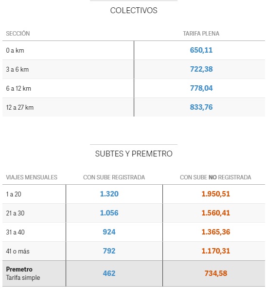 El incremento que regirá desde el domingo será del 4,8%. Entonces, el boleto de colectivos pasará de $ 620,07 a $ 650,11; el de subte de $1.260 a $1.320; mientras que los peajes de las autopistas 25 de Mayo y Perito Moreno pasarán de $ 5.133,74 a $ 5.380,16 en hora pico, y de $ 2.134,29 a $ 2.236,73 en la Illia.